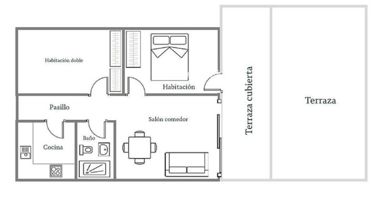 La vivienda cuenta con 67 m² construidos y se distribuye en dos habitaciones dobles, una de ellas con salida directa a una amplia terraza. Dispone de un salón-comedor de 20 m² con acceso a una agradable terraza de 20 m² con vistas al azul del mar, además de una espectacular terraza privada de 40 m², muy soleada, ideal para disfrutar al aire libre durante todo el año.